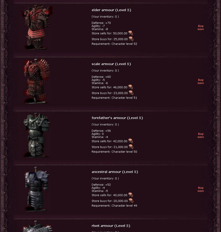 Link-ul "Premium" te conduce către zona de unde poţi cumpăra Cristale de Sânge. La Banca de Sânge poţi folosi Cristalele de Sânge pentru a cumpăra timp de Premium pentru contul tău sau le poţi schimba în aur la o rată dependentă de nivel. Cristalele de Sânge pot fi folosite de asemenea la negustor pentru a cumpăra amulete sau pot fi folosite pentru a-ţi îmbunătăţi arma pe pagina principală (sau de la pagina "Inventarului" dacă este folosită).. Inventar