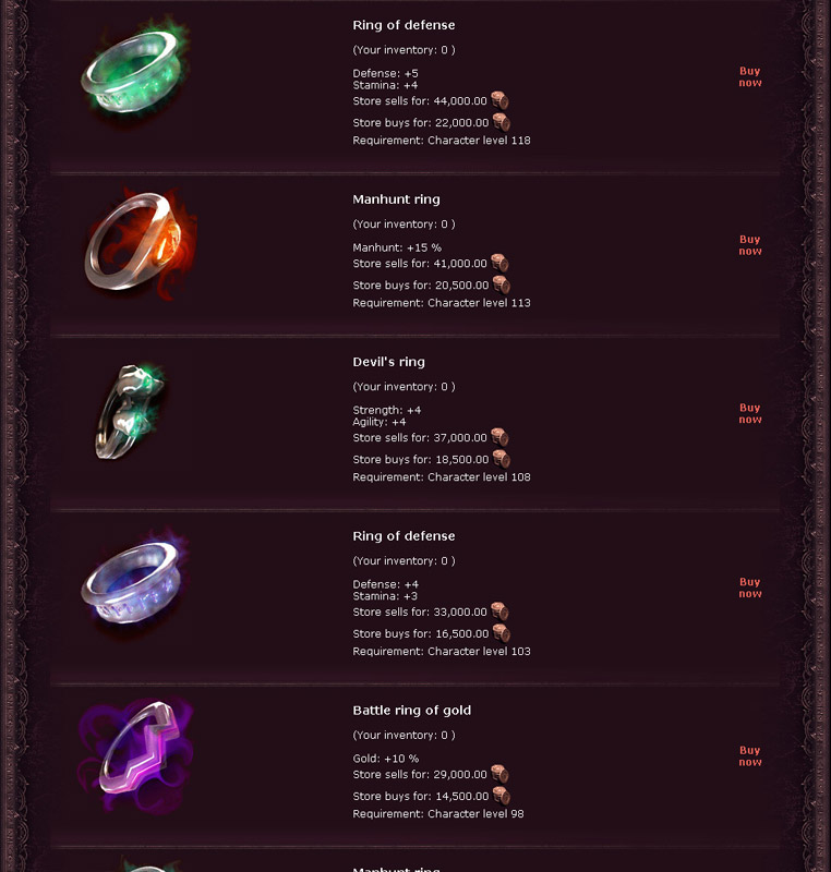 - Există diverse categorii de inele. În cazul inelelor care măresc rezultatele obţinute la vânătoarea de oameni sau prada în aur obţinută în luptă, este utilizat întotdeauna cel mai bun inel aflat în posesia ta. În cazul inelelor care îţi îmbunătăţesc valorile atributelor tale în luptă, au utilitate doar inelele cu cel mai înalt nivel. Fiecare inel este numărat o singură dată, indiferent câte inele din acea categorie posezi! Cel mai indicat este să ai în inventarul tău un inel pentru vânătoarea de oameni, un inel pentru prada în aur precum şi 2 inele diferite care îţi îmbunătăţesc valorile atributelor. Cumpără-ţi mereu cel mai bun inel din categoria respectivă!